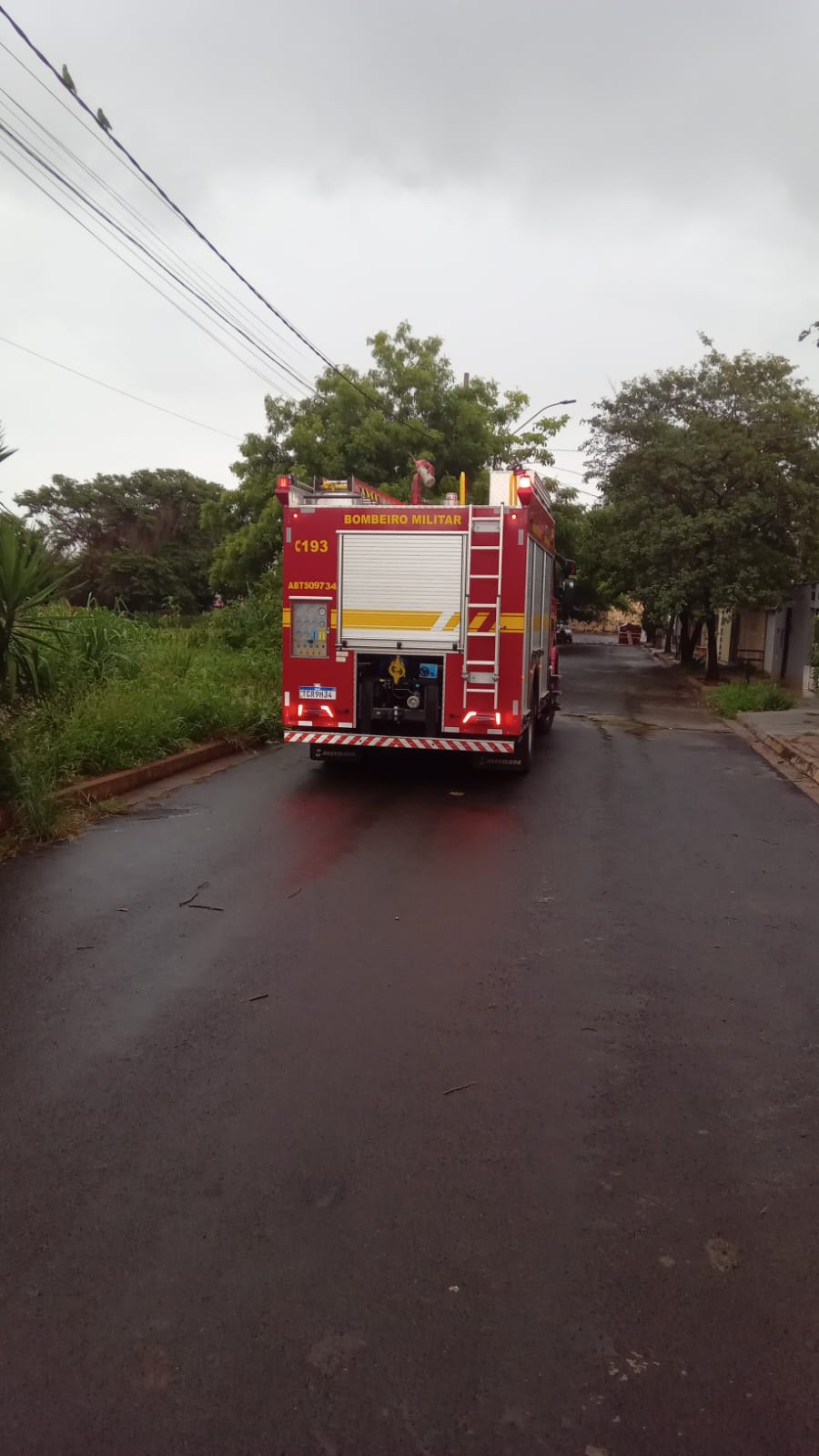 Segundo os bombeiros, a ocorrência foi provocada pelas chuvas que atingiram a região, fazendo com que uma árvore de médio porte cedesse e tombasse sobre o muro do imóvel. Com a queda, o acesso à garagem da residência ficou parcialmente obstruído, exigindo intervenção imediata.