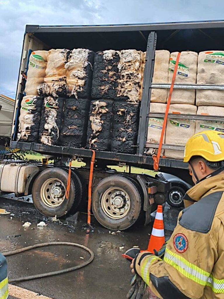 Um dos veículos transportava algodão prensado, carga que apresentou princípio de incêndio após a colisão. As chamas foram rapidamente controladas pelos bombeiros militares, com apoio das equipes da concessionária.