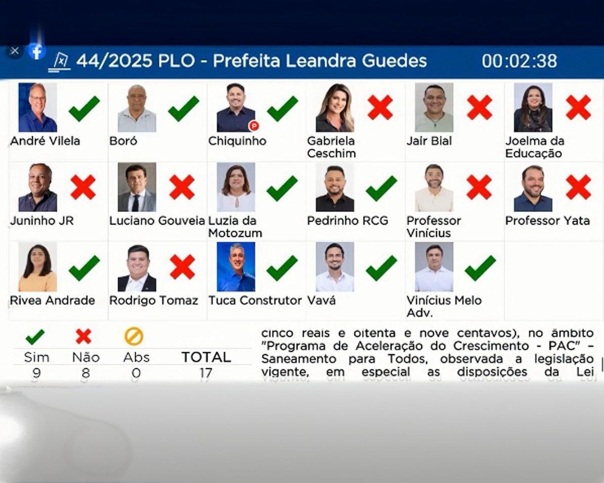 Votaram contra a matéria os vereadores Gabriela Ceschim, Jair Bial, Joelma da Educação, Juninho da JR, Luciano Gouveia, Professor Vinícius, Professor Yata e Rodrigo Tomaz. Já os votos favoráveis vieram de André Vilela, Boró, Luzia da Motozum, Pedrinho RCG, Rivea Andrade, Tuca Construtor, Vavá, Vinícius Melo e, por fim, Chiquinho Tomaz, que desempatou a votação.