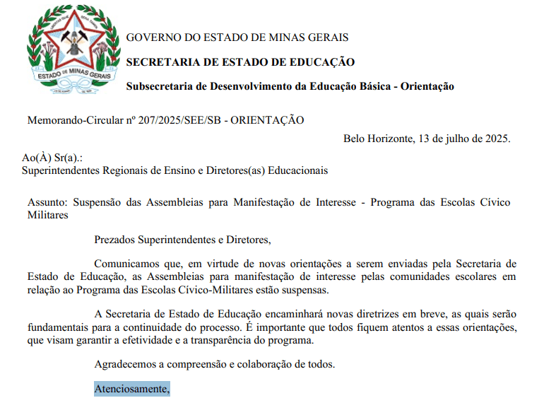 As assembleias previstas para discutir a adesão das comunidades escolares ao Programa das Escolas Cívico-Militares estão temporariamente suspensas em todo o estado de Minas Gerais. A informação foi oficializada no domingo, 13 de julho, por meio do Memorando-Circular nº 207/2025/SEE/SB – ORIENTAÇÃO, enviado pela Subsecretaria de Desenvolvimento da Educação Básica.