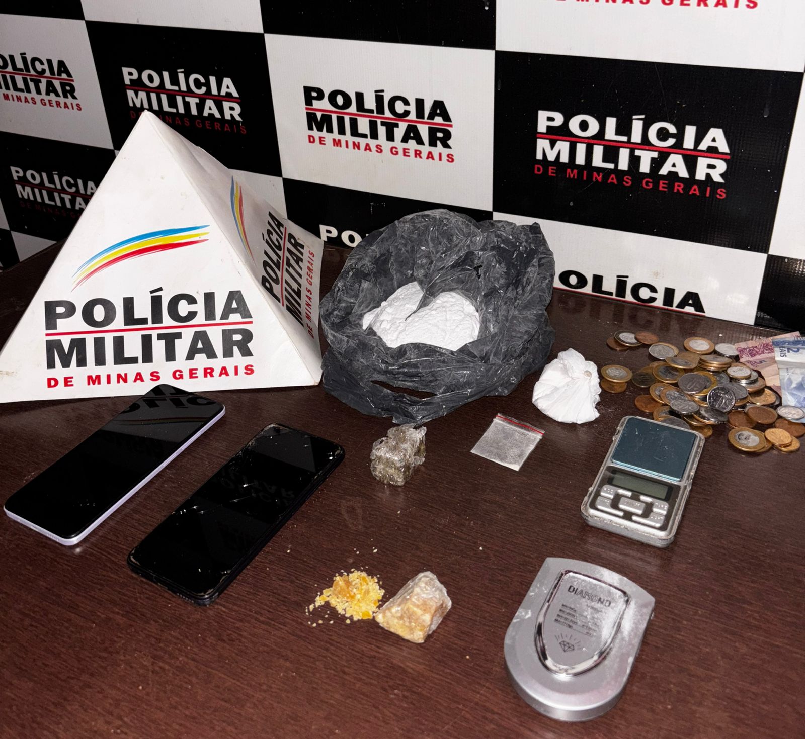 Diante das suspeitas e de denúncias anteriores que indicavam a venda de drogas em sua residência, os policiais realizaram uma busca domiciliar. No interior do imóvel, foram apreendidas porções de crack, maconha e cocaína, além de duas balanças de precisão, R$ 34,10 em dinheiro trocado e três aparelhos celulares, sendo um deles danificado pelo próprio autor no momento da ocorrência.