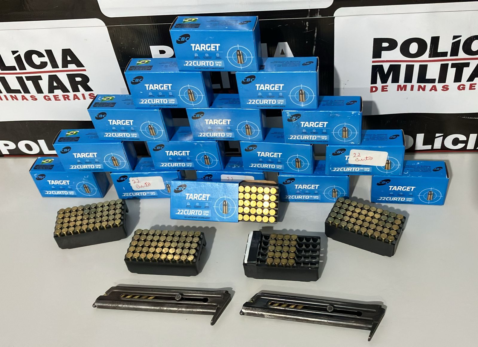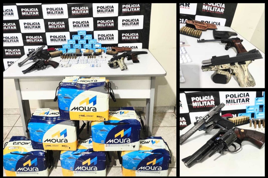 Entre os itens apreendidos estavam quatro armas de fogo, pistolas e revólveres de diferentes calibres, mais de 1,2 mil munições intactas, comprimidos semelhantes a rebites, coldres e baterias automotivas.