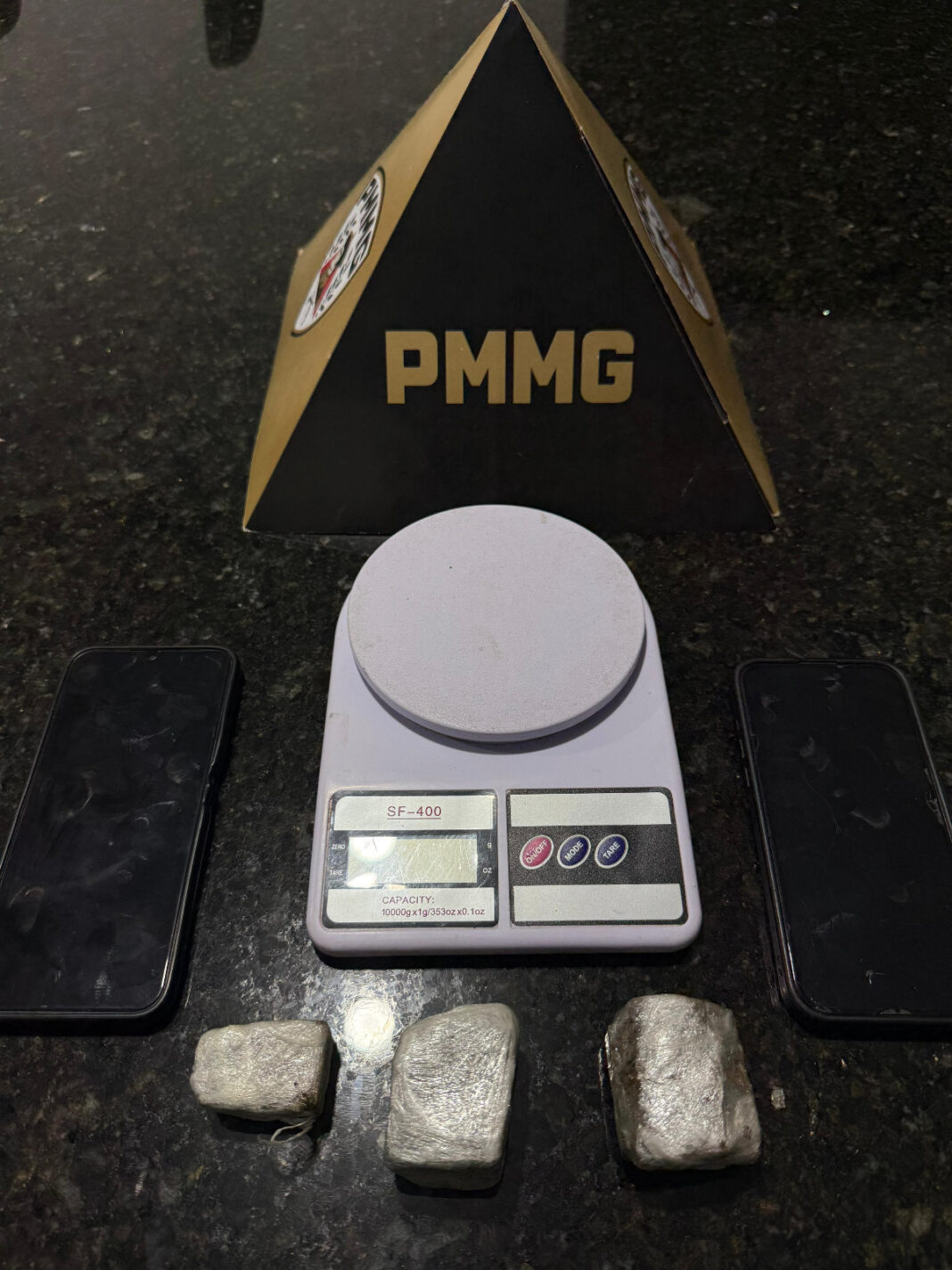Durante a busca no perímetro da residência, os policiais localizaram uma sacola plástica sobre o telhado contendo mais dois tabletes de substância análoga à maconha. Além dos entorpecentes, foram apreendidos dois aparelhos celulares e uma balança de precisão, equipamento comumente utilizado para a pesagem de drogas.