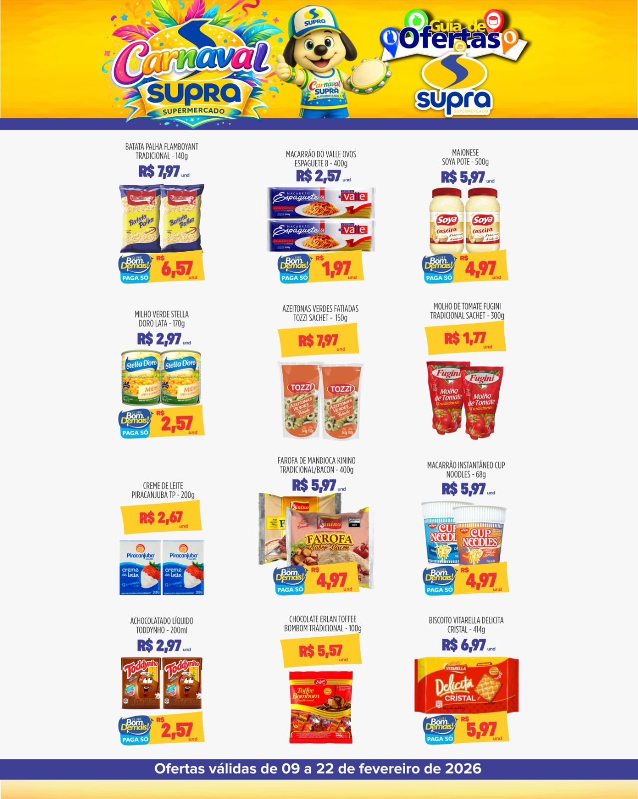 O Supra Supermercado iniciou a campanha Carnaval Supra, que segue de 09 a 22 de fevereiro, com uma série de ofertas distribuídas por todos os setores da loja. A ação tem como foco o período carnavalesco e busca oferecer condições especiais para consumidores que desejam abastecer a casa, organizar confraternizações e reduzir os gastos do dia a dia.